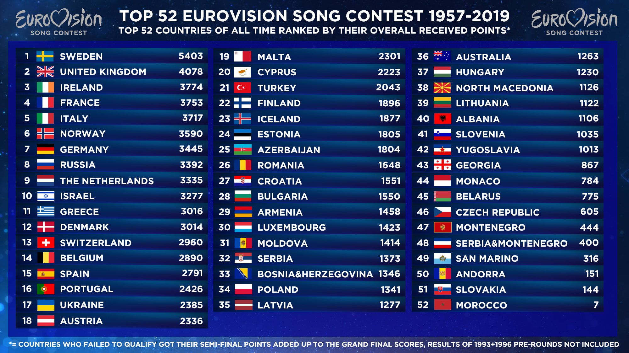 Steffen Turin 2022 On Twitter Since Everyone Loved It Last Time Here S The Scoreboard Of The Top 52 Countries Of The Eurovision Song Contest 1957 2019 Https T Co 2ei3m31c38